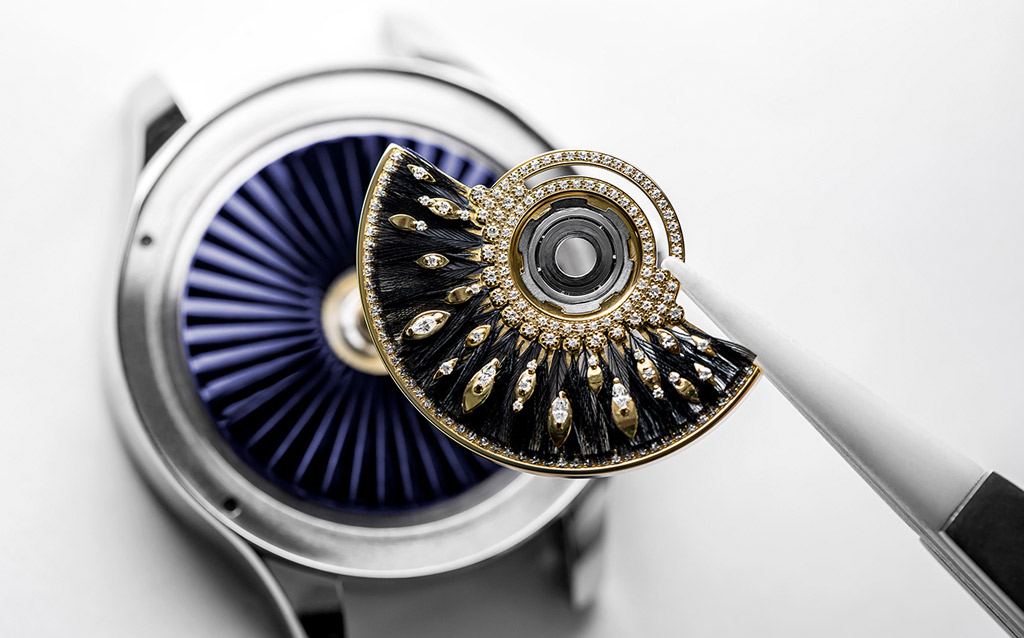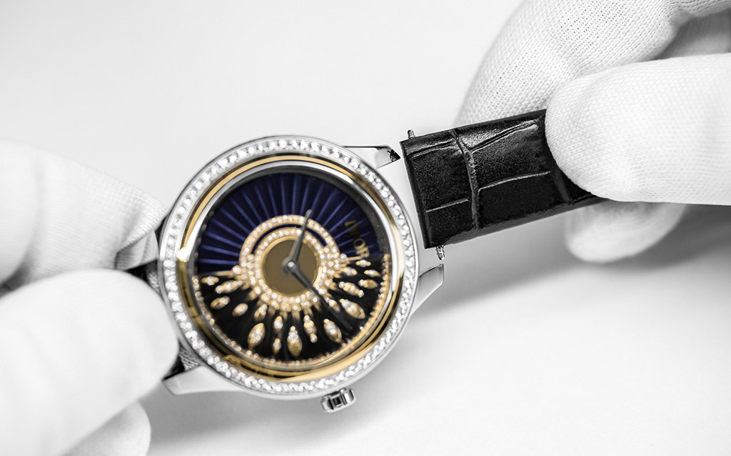 أمّا الوزن المتأرجح المزيّن بريش بريّ باللون الأسود أو الأبيض، فجاء لينعش نعومة قرص الساعة المصنوع من عرق اللؤلؤ الأبيض أو الأسود المتقزّح، والمعزّز بالذهب والألماس المرصّعين على الإطار الخارجي.