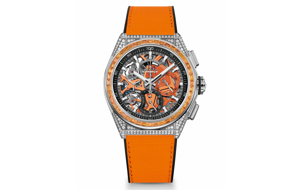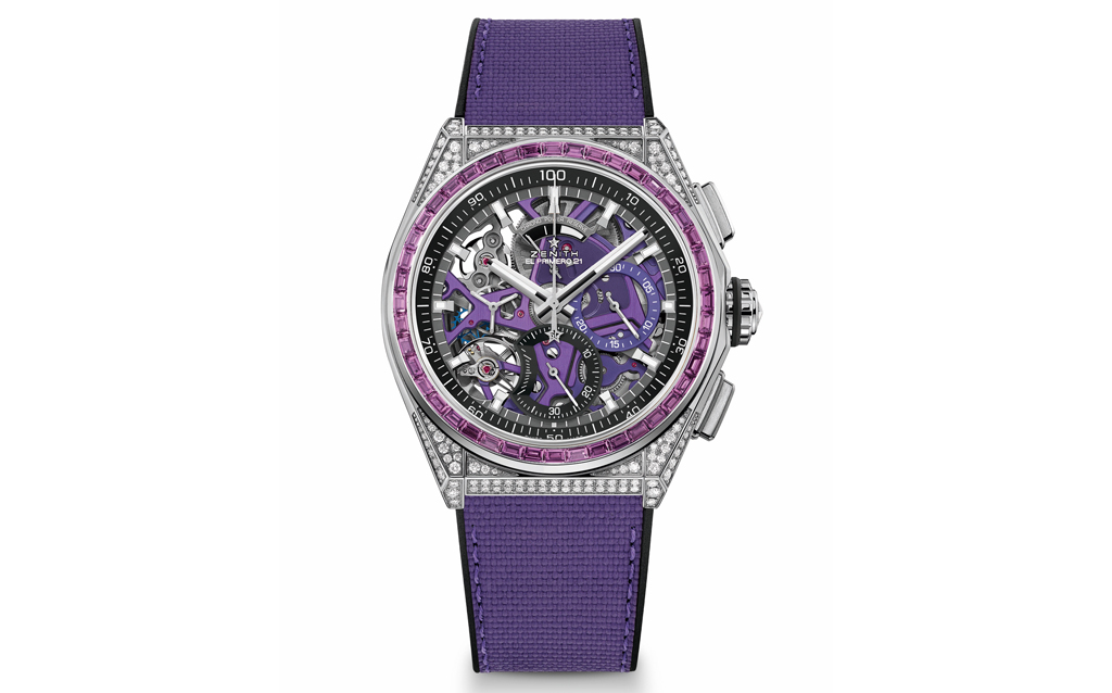 While brightly coloured dials have recently enjoyed a comeback in watchmaking, Zenith has taken an unexpected and novel approach in the DEFY 21 Spectrum series, by incorporating striking colours everywhere but the dial. Whether it’s the coloured chronograph movements achieved through innovative pigmentation processes or the natural brilliance and hue of precious stones, the DEFY 21 Spectrum is a whole new take on vivid, kinetic vibrancy.