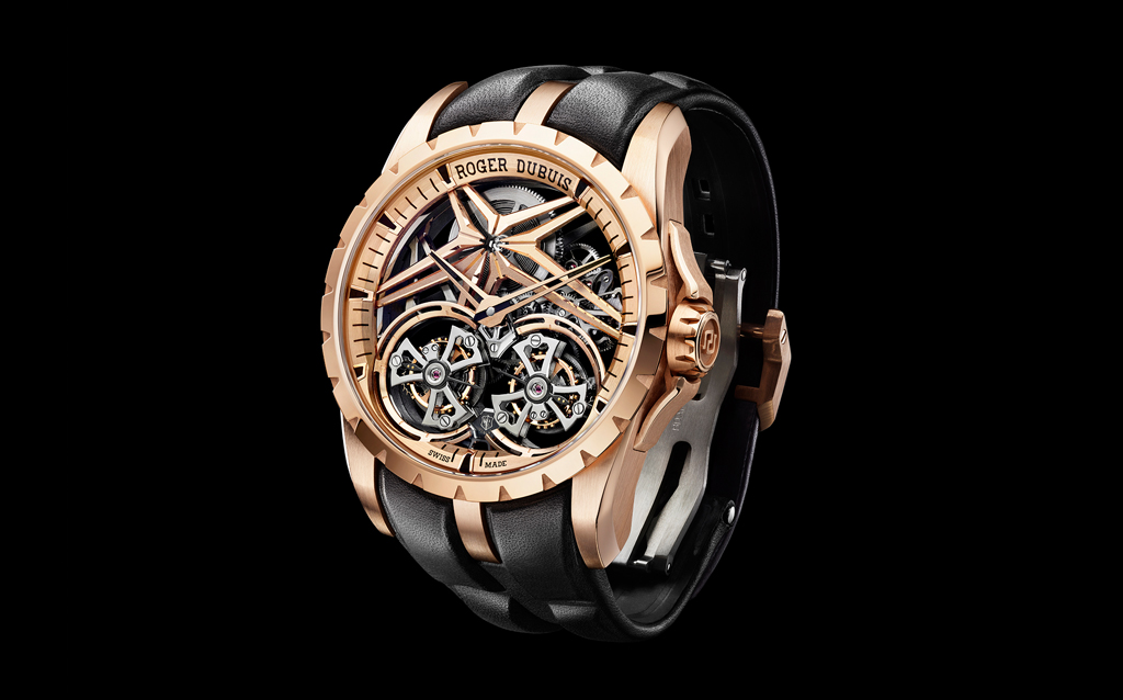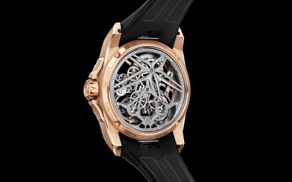 Roger Dubuis has consistently demonstrated its penchant for excess and extravagance. An inclination matched by a fearless determination to challenge the rules through a resolutely expressive and contemporary approach. Since 2005, Roger Dubuis has been shaking up the world of Haute Horlogerie with its inimitable artistic skeleton design, regularly reinterpreted by disruptive materials and designs. For the new Excalibur Skeleton Double Flying Tourbillon, the goal was to optimise each of its components so as to offer the members of a hedonistic tribe a watch entirely aligned with their desires and their lifestyle. An ideal blend of design, performance and comfort. The eminently contemporary architectural calibre powering this latest model represents Roger Dubuis’ extreme obsession with rewriting the codes of an institution that it dares to defy.