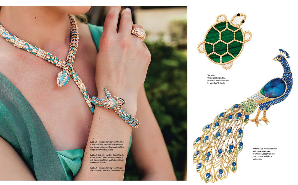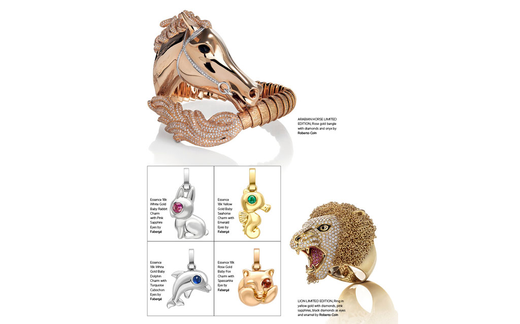 رسم الإنسان الأول أشكال الحيوانات على جدران الكهوف التي سكنها وصنع من أسنانها وعظامها في قلائد لاستجلاب قوتها وحماية نفسه من بطشها. ثم تطورت العلاقة بينهما وصارت هذه الحيوانات مصدر إلهام لمصممي المجوهرات في ألوانها وأشكالها، لكل منها سرها وخصوصيتها الجمالية يرتديها الناس للزينة والتباهي. ربطت الكثير من دور المجوهرات تصاميمها بالحيوانات فمن لا يعرف نمر Cartier، وفراشات Van Cleef & Arpels وطيورها، وثعابين Boucheron وBulgari وأسماك ودلافين Chopard.
