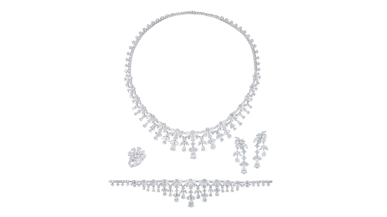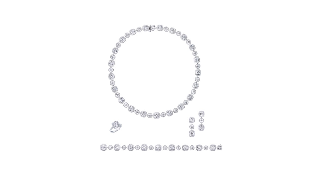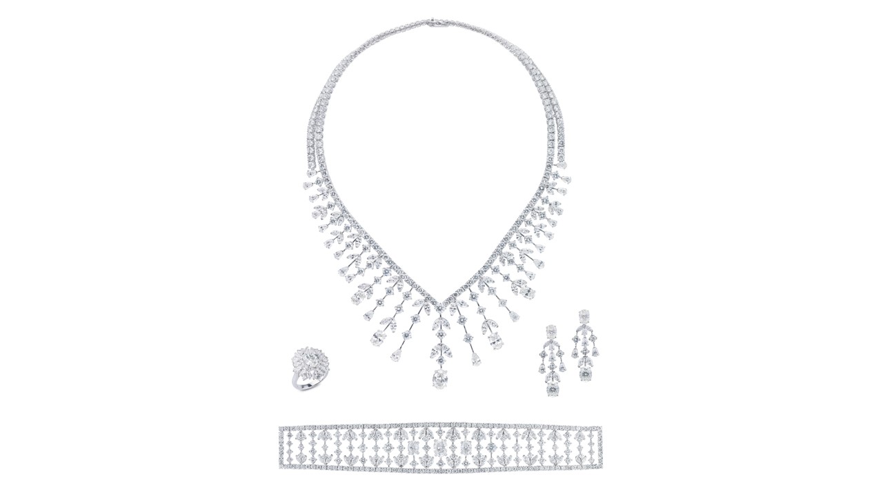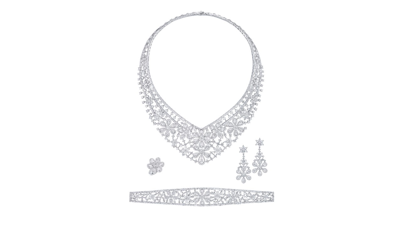 يتألّف كلّ طقم من قلادة وسوار وقرطَي أذن وخاتم بتصميم متشابه يضمّ مئات الألماسات. وتستعين هذه الزينة الباهرة الفريدة المصنوعة على يد حرفيّي دار معوّض بتاريخ الدار العريق ودرايتها العميقة فتبرز بوضوح في هذه المجوهرات الساعاتُ الطويلة والعمل المضني والاتقان والانتباه إلى أدّق التفاصيل.
