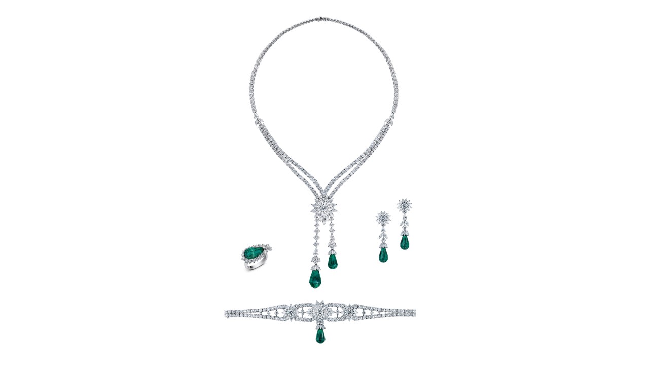 وقد وقع الاختيار على الألماس الأبيض لهذه الأطقم المذهلة لأنّه التعبير الأروع عن الرومانسية الكلاسيكية. فمن الرُقيّ الكلاسيكي الذي تتّسم به تصاميم الزهور الطبيعية إلى التعبير الجريء عن الذات عبر إدخال الزمرّد الكولومبي في التصميم، لا شكّ في أنّ أطقم العرائس من دار معوّض تُبرز الشخصية الفريدة التي تتحلّى بها كلّ امرأة بأسلوب وهّاج متلألئ يخطف الأبصار.