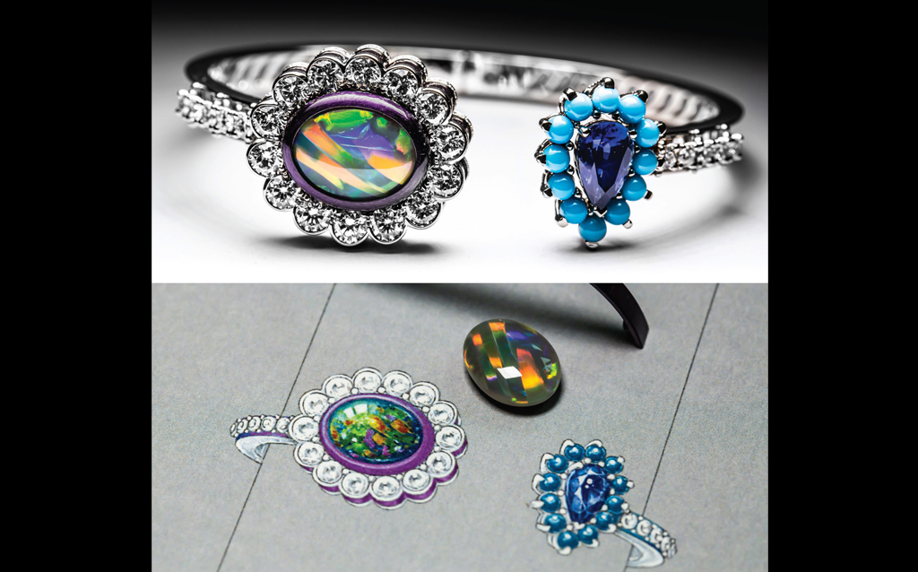 الألماس والزمرد والصفير الأزرق أو الزهريّ بقطع مخروطيّ، أو كمثري أو وسادي الوسادة أو بيضاوي، وجدت إضافات مرحة من خلال أحجار الاسبينال الأحمر، التورمالين بألوانه المختلفة، الكونزايت، الفيروز، الأوبال واللؤلؤ.
