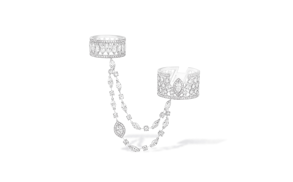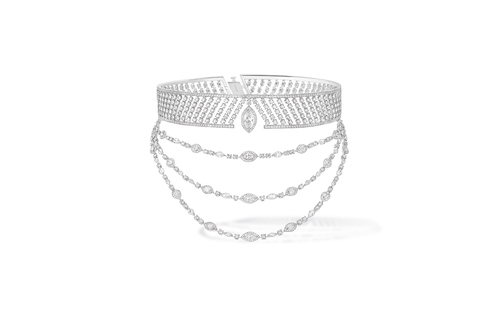 يضمّ عقد Choker 77 ألماسة متراصفة بقصّة الماركيز، وتتدلّى منه ثلاثة صفوف من الألماس قابلة للنزع. يكتمل العقد مع خاتم مزدوج للإصبعين المتوسط والبنصر، تربط بين قسمَيه سلسلة رقيقة مرصّعة بالألماس، إلى جانب سوار وأقراط غير متوازية تُعلّق بشحمة الأذن من نقاط مختلفة.