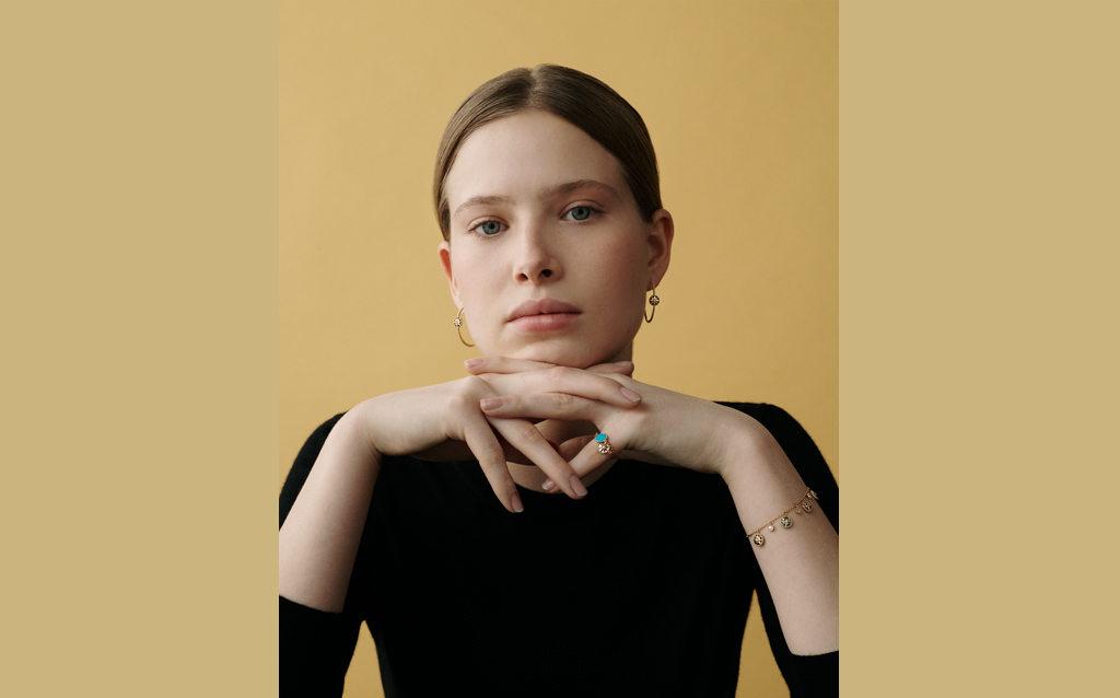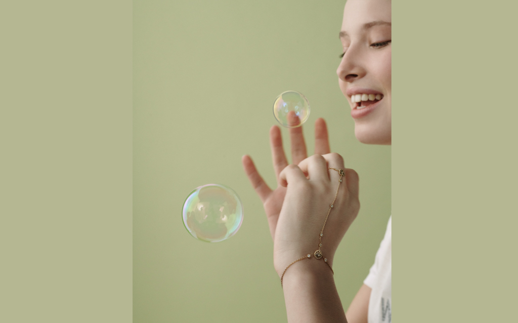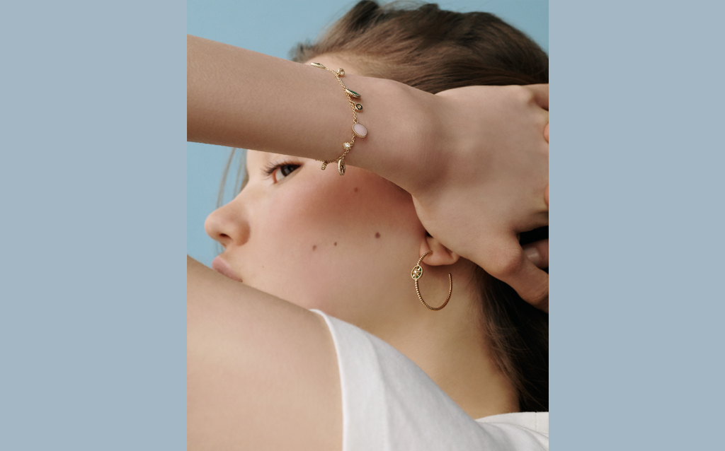 Necklaces and bracelets of white gold and mother-of-pearl, of yellow gold and lapis lazuli, turquoise and mother-of-pearl, or else rose gold with onyx and pink opal, as well as two sautoirs in yellow gold with turquoise, lapis lazuli and mother-of-pearl or chrysoprase, mother-of-pearl and pink opal. This year the medallion also comes in pavé diamond versions as well as rose gold with onyx, and the offer has been broadened to include four pendants and five reversible rings.