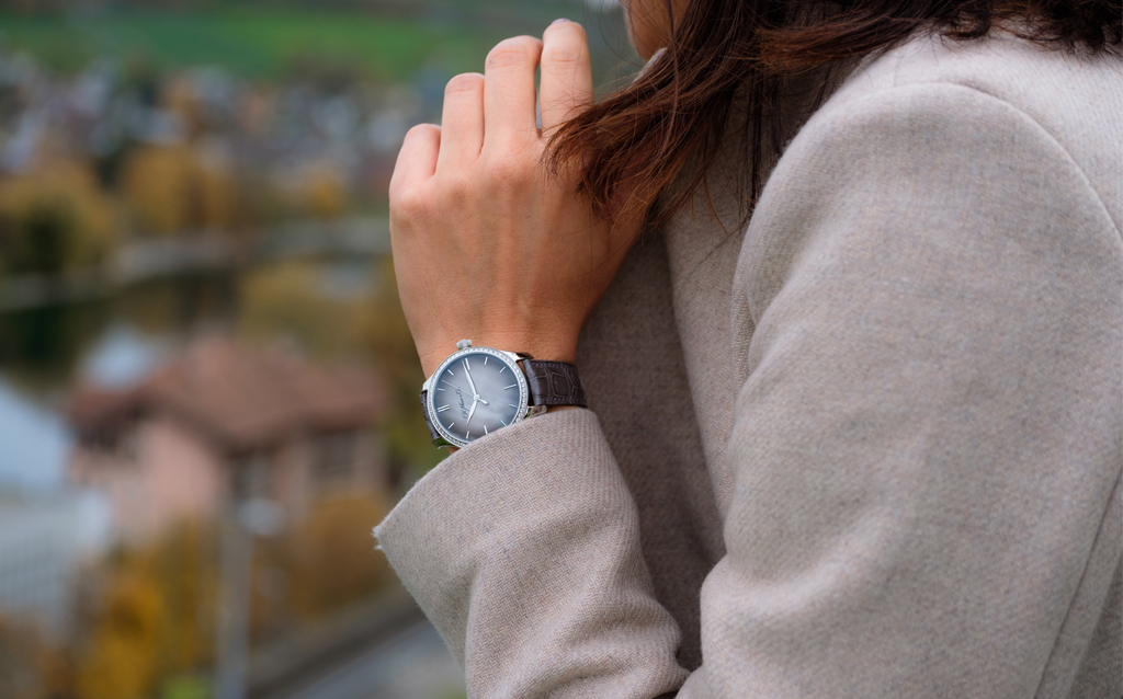 The brand-new 38 mm case on the Endeavour Diamonds Bucherer Blue Editions –also made from steel – is perfectly proportioned. The bezel is set with diamonds, which are exquisite details on the fumé dial ofthis timeless piece.